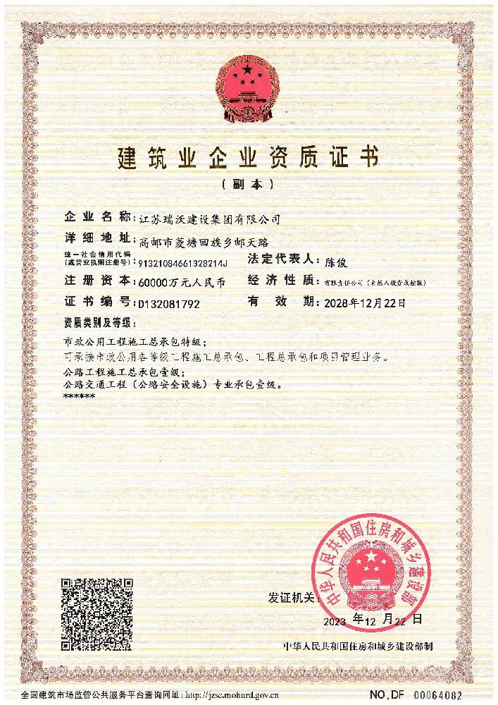 江蘇瑞沃建設(shè)集團(tuán)有限公司成立于2007年,是一家以市政、交通工程建設(shè)為主導(dǎo),集房屋建筑、交通安全設(shè)施、城市道路照明工程、電力工程、隧道工程、航道工程及投融資為一體的綜合性企業(yè)。企業(yè)注冊資本60000萬元,現(xiàn)有各類技術(shù)人員580人,其中中、高級以上人員498人,注冊類人員268人,一、二級建造師166人。公司榮獲“江蘇省建筑業(yè)優(yōu)秀企業(yè)”、“江蘇省五一勞動獎狀”,連續(xù)多年被評為“揚(yáng)州市先進(jìn)企業(yè)”、“江蘇省建筑業(yè)百強(qiáng)企業(yè)”,連續(xù)八年蟬聯(lián)百強(qiáng)企業(yè)基礎(chǔ)設(shè)施類第一名。